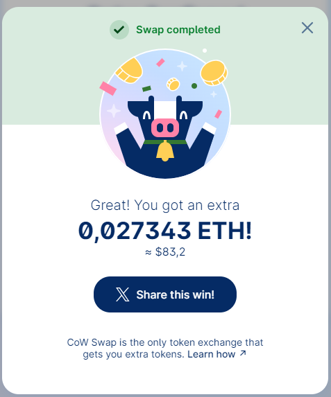 Además, gracias a Cow Protocol puedes obtener ventajosos Swaps: