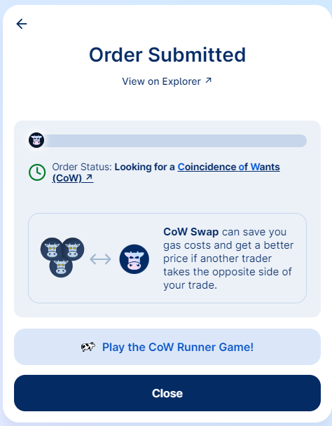Cuando vas a hacer un SWAP en CoW Protocol lo que se hace es crear un grupo de “ordenes”, lo cual se hace off-chain, evitando pagar por una transacción fallida y además nos permite pagar en el token que estamos intercambiando, y evitamos así gastar el Ether.